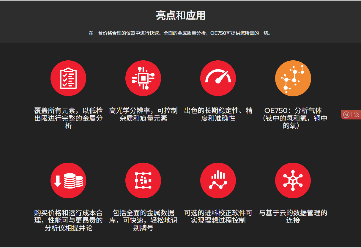 日立直读光谱仪可用于分析所有主要合金元素,并识别金属中含量较低的杂质、痕量元素和关心元素,OE750还覆盖了罕见的应用,例如铜中的氧气和钛中的氧气、氮气和氢气。