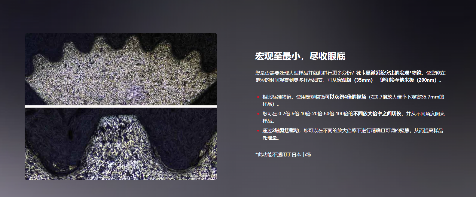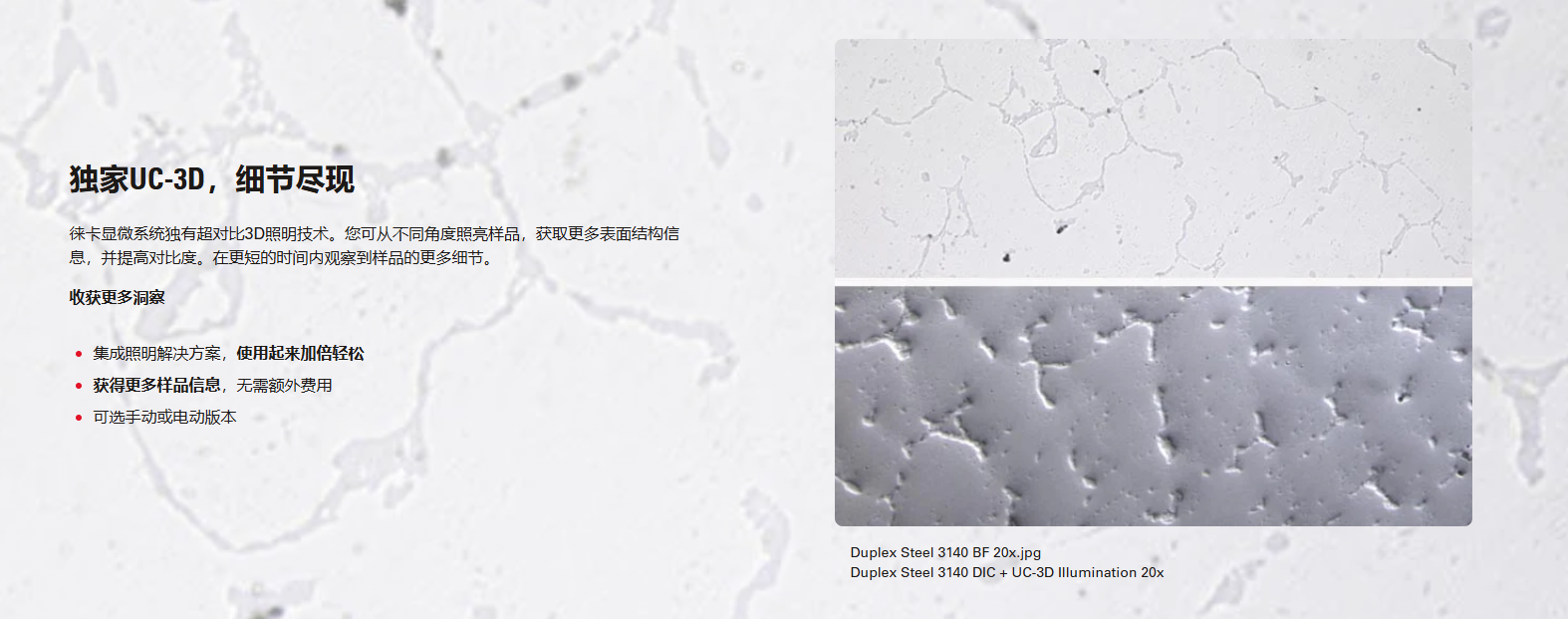 采用独特的UC-3D照明装置,实现更高的对比度,无论是金相学、医疗设备制造还是微电子领域,高度模块化的设置均能够满足不同的需求